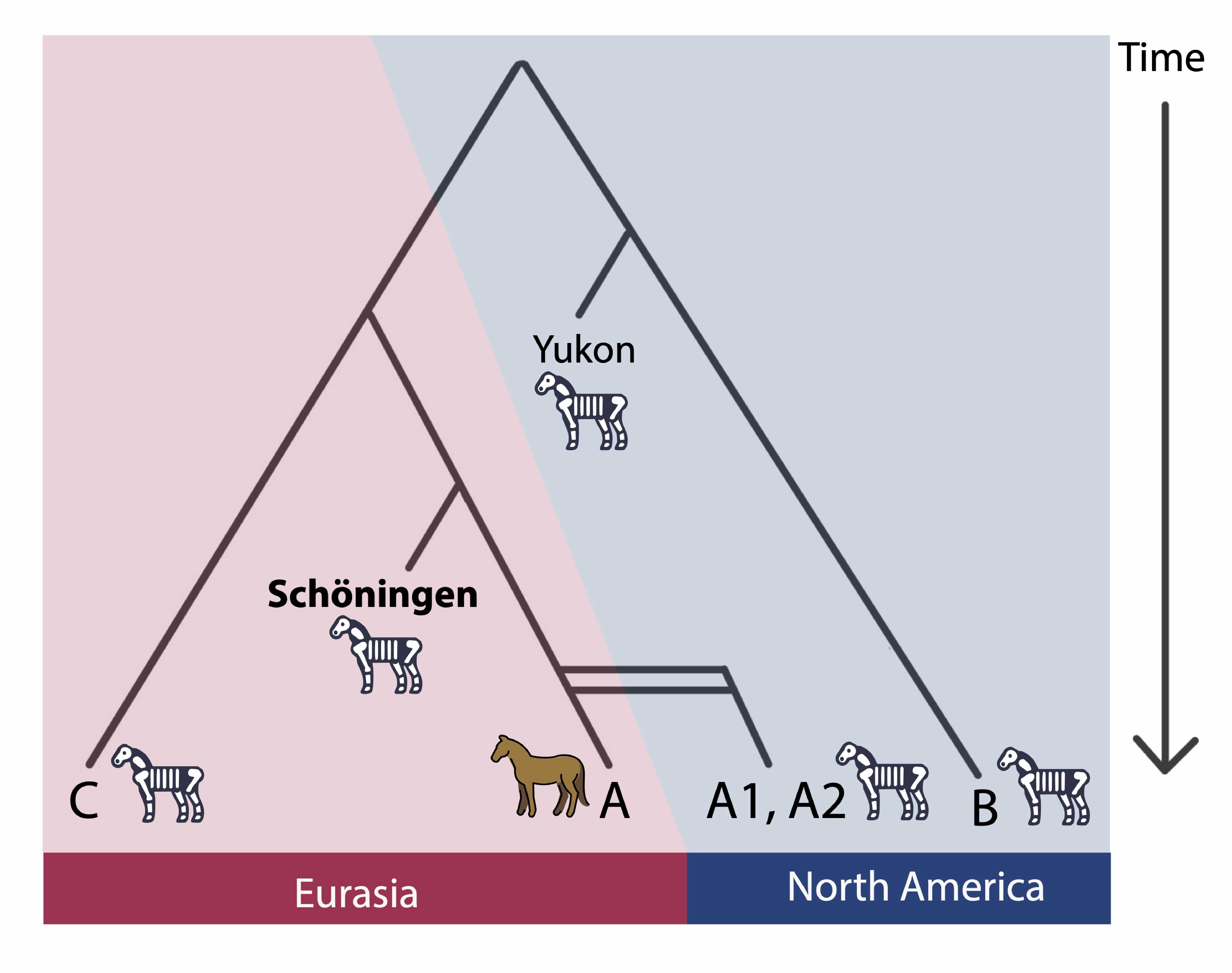 Bu çerçeveye yerleştirilen Schöningen genomları olağanüstü olduğunu kanıtladı. Tüm yaşayan atları içeren anne soy Clade A'nın tabanında otururlar (E. Caballus– E. FerusVe E. przewalskii). Bu, daha önce bilinmeyen, derinden ıraksak bir at evrimini ortaya çıkardı.