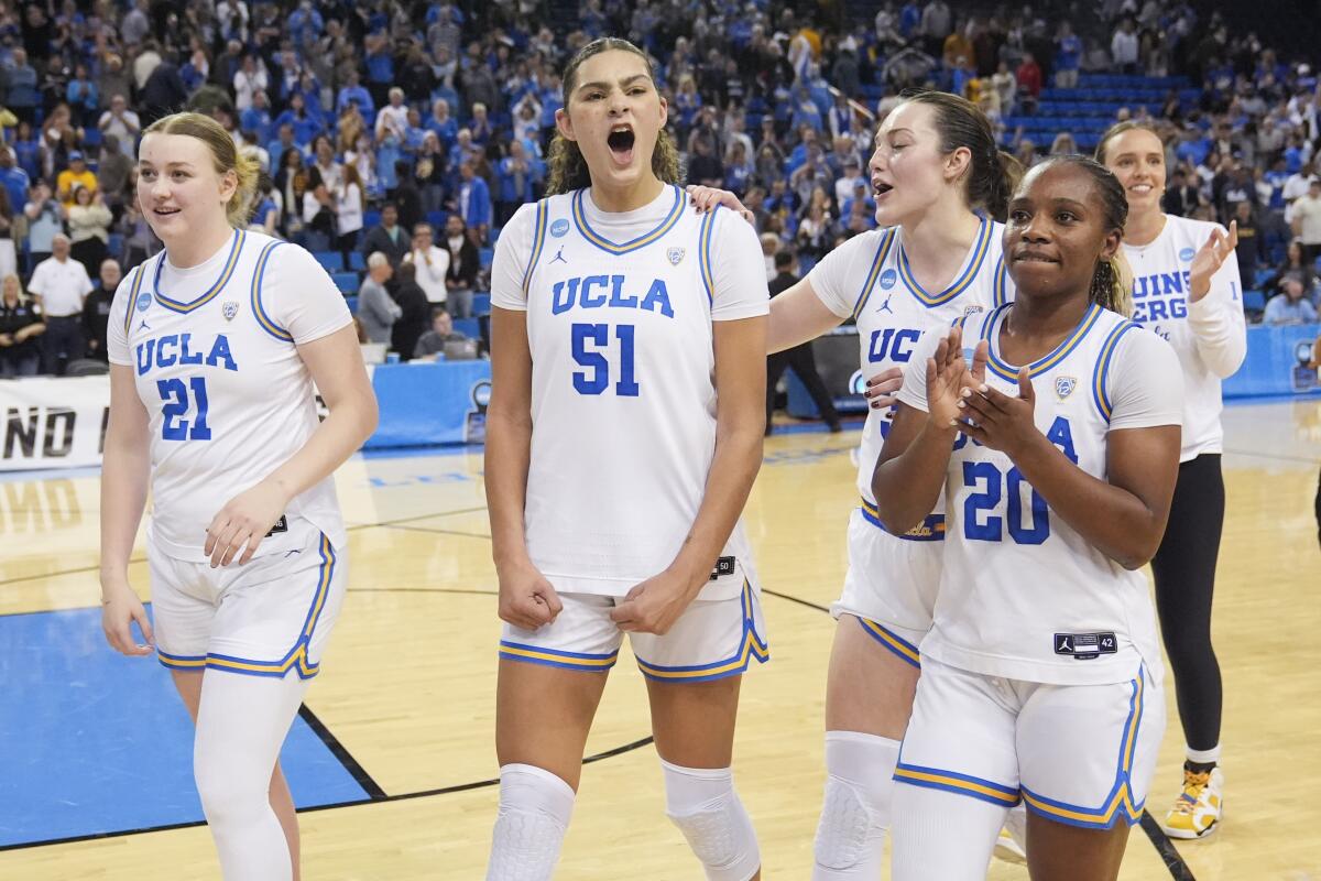 UCLA oyuncuları, Pazartesi günü Pauley Pavilion'da düzenlenen NCAA turnuvasının ikinci turunda Creighton'a karşı aldıkları galibiyetin ardından sahadan ayrılırken kutlama yapıyor.