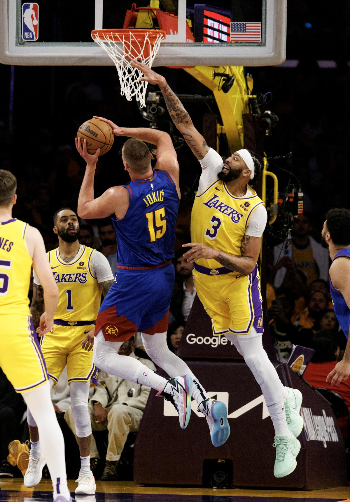 Lakers forveti Anthony Davis (sağda), Perşembe günü ilk çeyrekte Denver Nuggets'ın pivotu Nikola Jokic'in şutunu engellemeye çalışıyor.