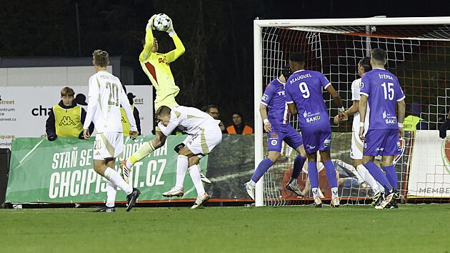 Artis Brno'nun kalecisi Tomáš Holý, Sparta ile oynanan maçta topun peşinde.