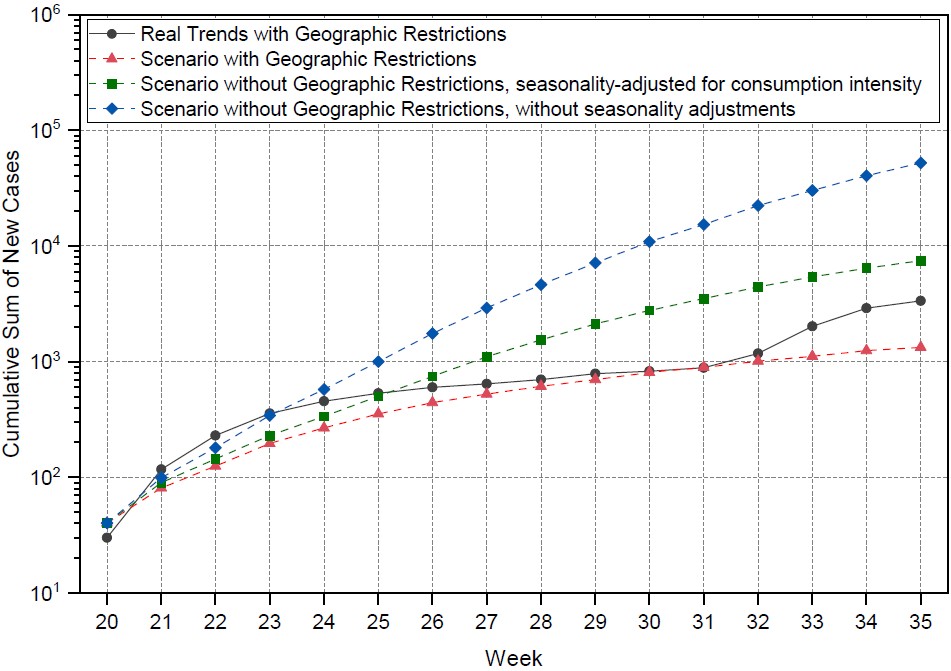Toplam işlemleri sabit tutmak ancak 2019'da olduğu gibi mekânsal olarak yeniden dağıtılan enfeksiyonlar, kısıtlama olmadan daha hızlı yükselecektir. İlk dört hafta boyunca – çoğu harcama meydana geldiğinde – sınırsız senaryoya göre vakalarda en az% 17'lik bir azalma tahmin ediyoruz ve sezonluk varsayımlarına bağlı olarak 20-35 haftalarında binlerce daha az kümülatif vaka. Yerelleştirme etkisi, kilit harcama penceresi sırasında açık bir halk sağlığı faydası elde etti.