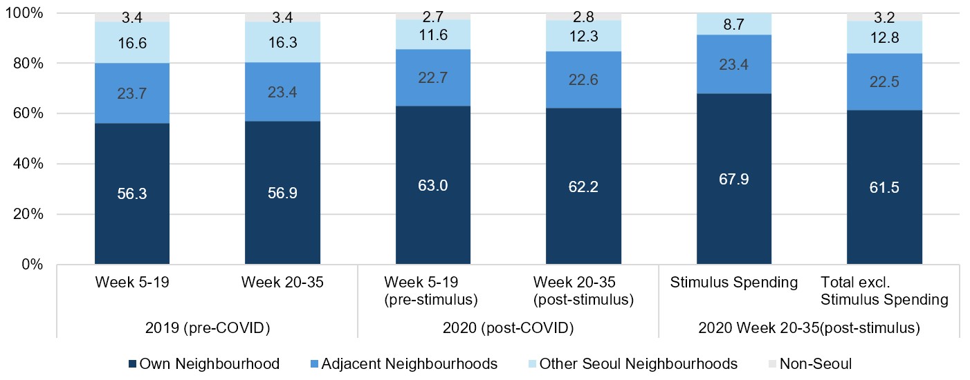 İşlemlerin – kendi mahallesi, bitişik mahalleler, Seul'in diğer kısımları ve Seul dışındaki – ödeme yapmadan önce ve sonra 2019 ile referans olarak karşılaştırdık. - Bu mekansal kayma iletim için önemli miydi?