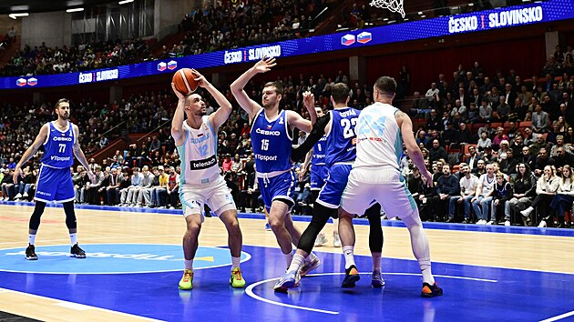 Jan Zdek (5) ve Martin K (31), Çek Cumhuriyeti ile Slovenya arasındaki Dünya Basketbol Şampiyonası ön eleme maçında kavga ediyor.