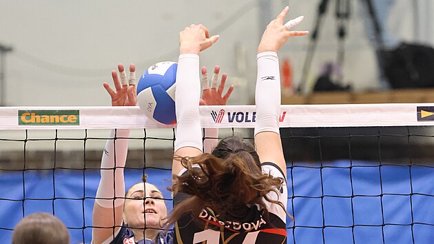 Frýdek-Místek kaptanı Veronika Strušková, Ostrava blokçusu Michaela Drozdová ile filede düello yapıyor.
