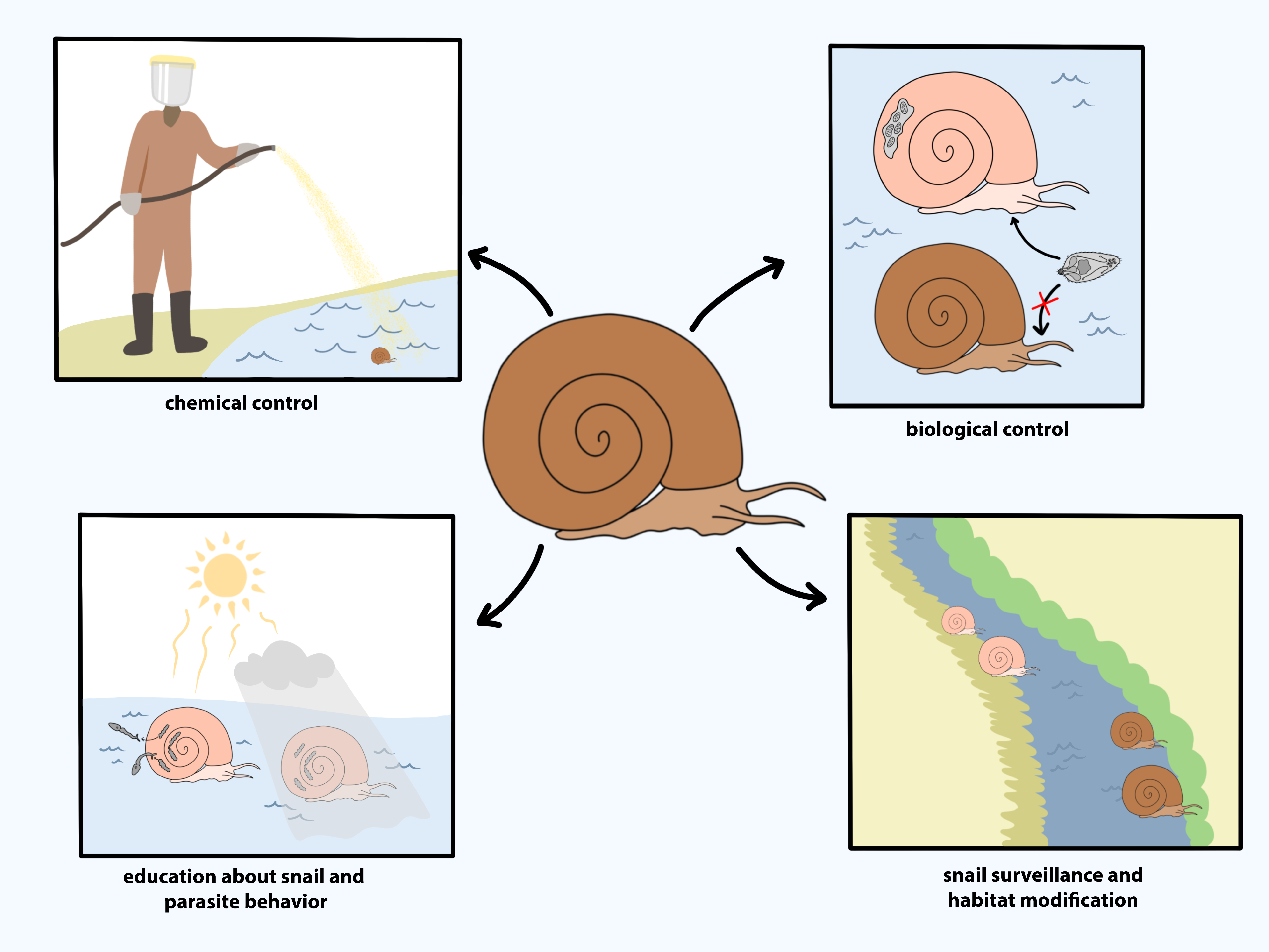 Son yıllarda, bilim adamları Mollüsit özgüllüğünü ve etkinliğini arttırmak, “gen sürücü” teknolojisini takip etmek veya salyangoz ve topluluk davranışına dayanan daha bütünsel yaklaşımlar gibi daha verimli salyangoz konak kontrol yöntemleri için modern yolları araştırmıştır. Zaten, salyangoz ev sahiplerinin genomik kaynaklarındaki son gelişmeleri kullanmak, potansiyel mekanizmaları ortaya çıkardı. enfeksiyon uyumluluğu ve biyolojik kontrol seçeneklerine doğru bir yol sağladı. Ayrıca, gelişmeler gözetim ve teşhis araçları salyangoz davranışı ve enfeksiyon arasındaki ilişkiyi anlamaya yardımcı olacaktır.