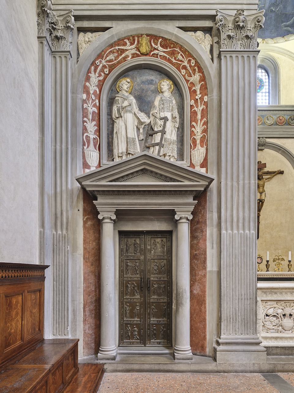 Medici ailesi tarafından yaptırılan iki kapı, Donatello'nun olgun heykel araştırmalarının en yenilikçi örnekleri arasında yer alıyor. Her kapı, kayıp balmumu tekniği kullanılarak bronzdan dökülmüş iki yapraktan oluşuyor ve çıkıntılı bir pietra serena mimari çerçevesi içine yerleştirilmiş bir kabartma poliptik gibi yapılandırılmış.