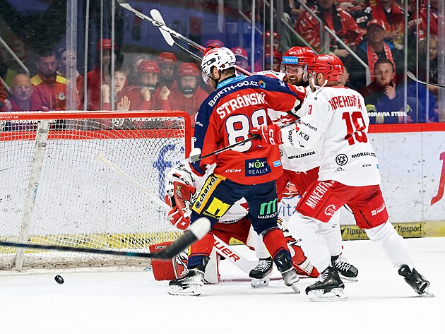 Marian Admek ve Patrik Hrehork, Tineck bariyerinin önünde Pardubice'den Jan Strnsk ile uğraşıyor.