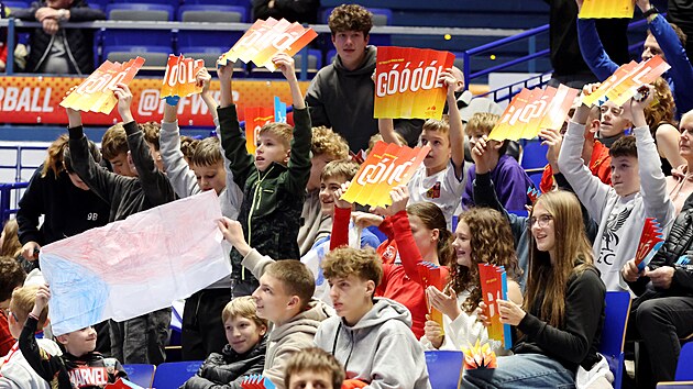Çek kadın florbolcuların antrenörü Lukáš Procházka, Norveçlilerle birlikte maçı oyuncularla birlikte izliyor.