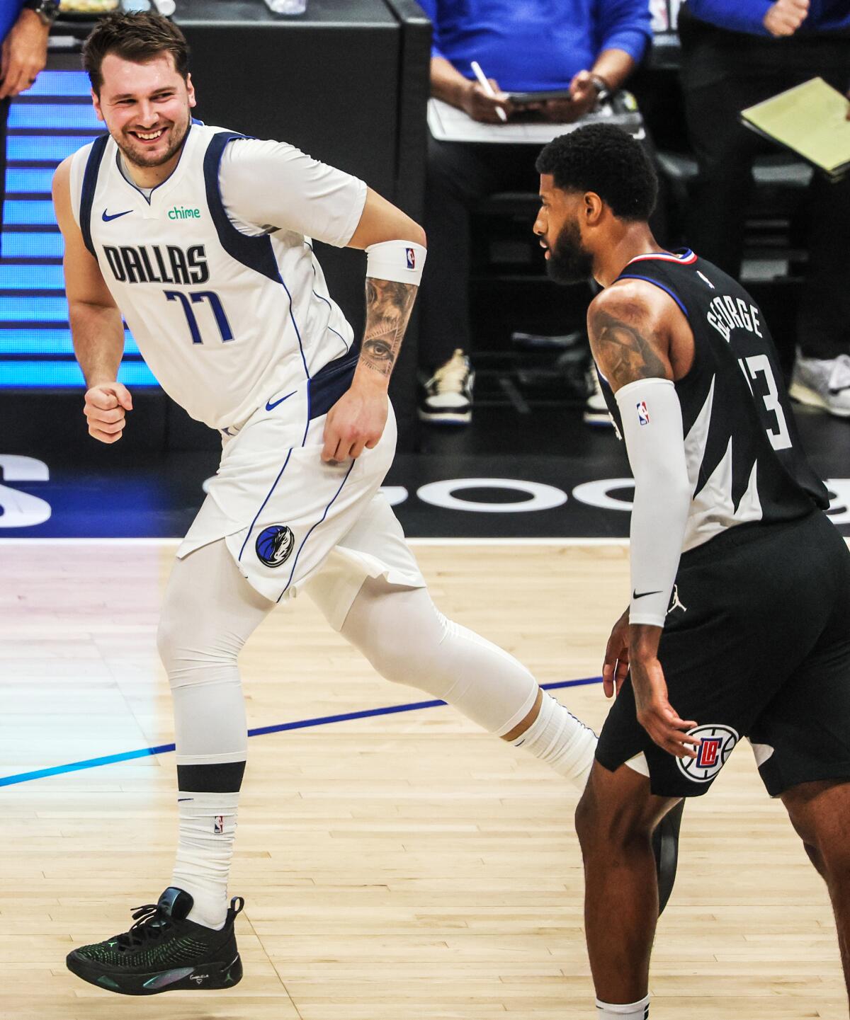 Mavericks guardı Luka Doncic (solda), 2. maçın ilk yarısında basket attıktan sonra Clippers'ın forveti Paul George'a alaycı bir gülümseme sunuyor.