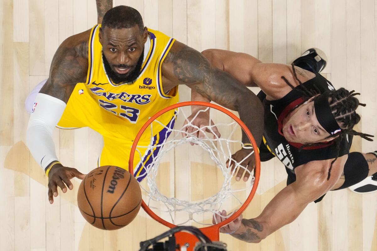 Lakers'ın forveti LeBron James (solda) ve Nuggets'ın forveti Aaron Gordon, Pazartesi günü Denver'da oynanan 2. maçta topun çemberden sekişini izliyor.