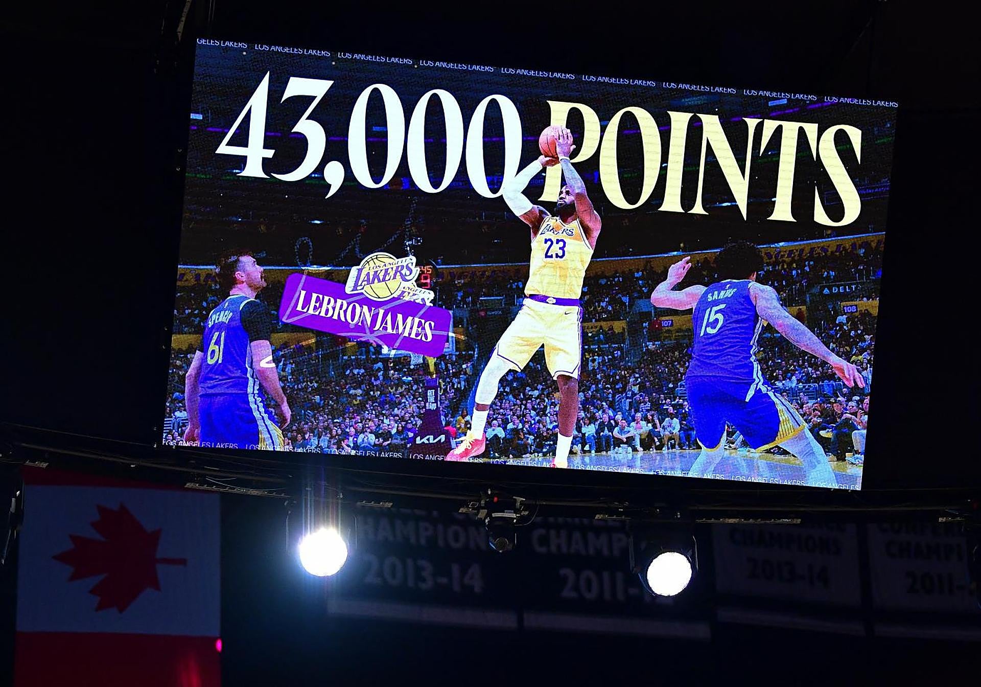 Crypto.com Arena skor tablosunun LeBron James'in NBA'deki 43.000 sayısını ölümsüzleştirdiği an.