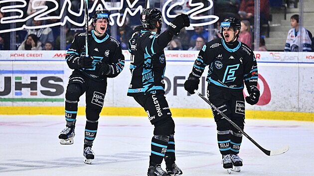 Bir Karlovy Vary hokey oyuncusu Liberec'in buzunda attığı golü kutluyor.