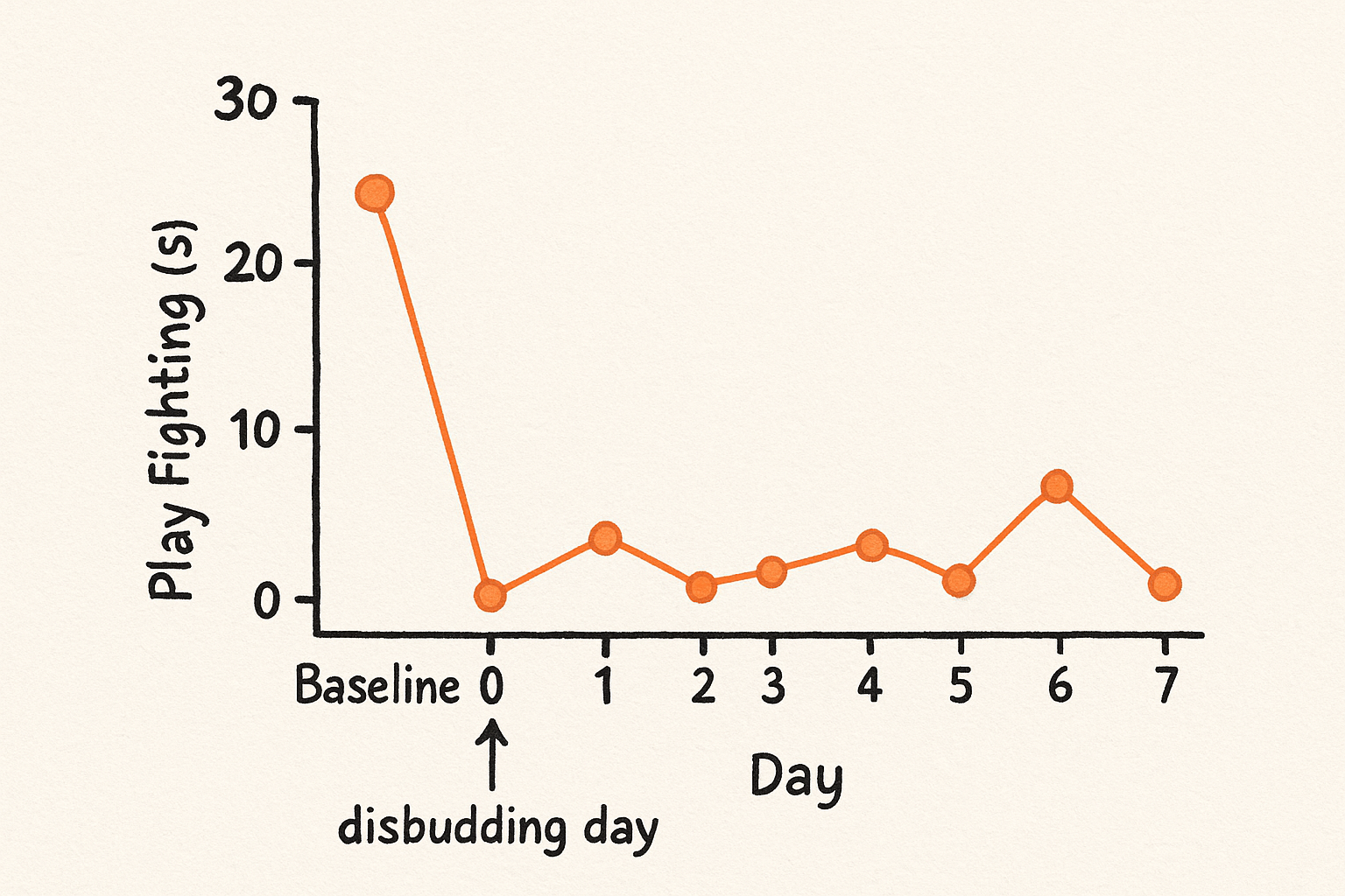 Oyunla savaşma süresindeki değişiklikler “taban çizgisi” den (disbudding'den önce) çıkıştan 7 gün sonra (günde 4 saatlik gözlem başına saniyeler oyun savaşı). ChatGPT (Openai) kullanılarak Şekil 1'den (doi: 10.1007/s44338-025-00105-7) uyarlanmıştır.