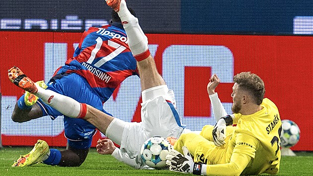 Slvistik kalecisi Jindich Stank, Pilsenli Rafie Durosinmi'nin önüne müdahale ediyor.