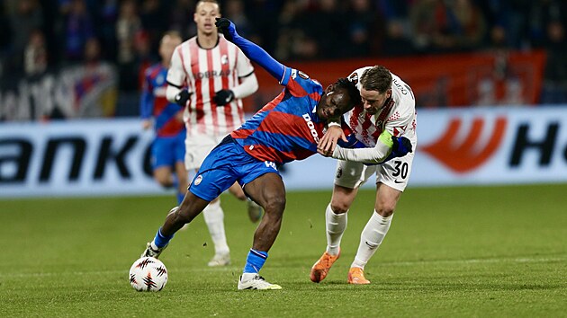 Pilsen kaptanı Matj Vydra bana vurmaya çalışıyor, Freiburglu Maximilian Eggestein ona saldırıyor.