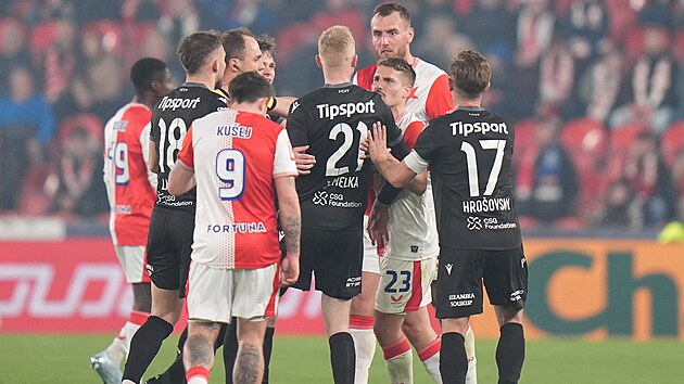 Slavia ve Plzeň futbolcuları arasındaki rekabet.