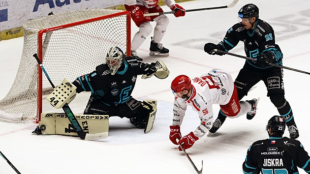 Karlovy Vary kalecisi Dominik Frodl, Třinec'in düşen hücum oyuncusu Marko Daně'nin önünde diske tekme atıyor.