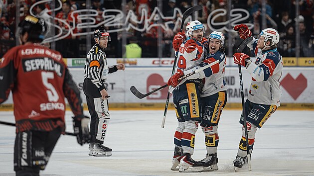 Pardubice hokey oyuncuları Kelemena'nın golünden memnun (solda)