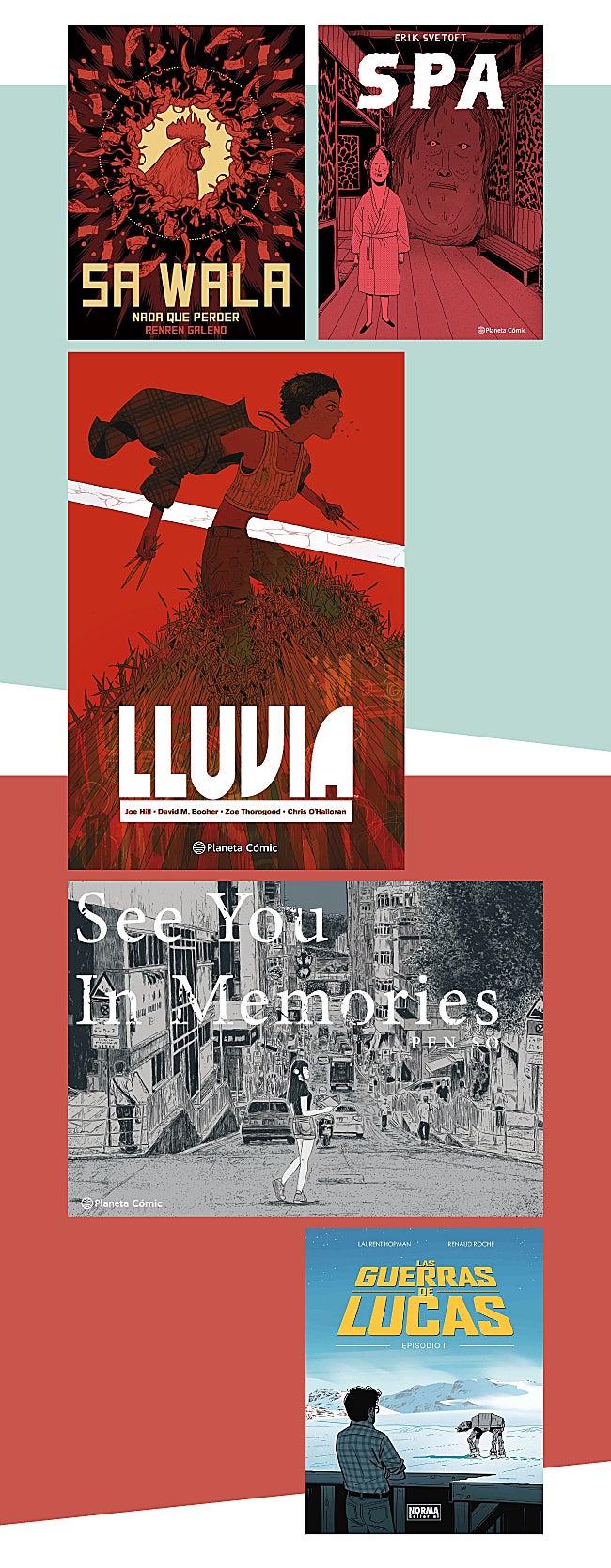 Dikkat olmak 'Sa Wala'Grafito Editorial tarafından desteklenen Renren Galeno'nun çalışması. Borçtan mahvolmuş bir ailenin ve bir horozun hikayesi… tüyler ürpertici. hikayeleri 'Spa'Planeta menüsünde. Büyük Junji Ito'nun dehşet verici eserini dikkatle inceleyen Erik Svetoft'un elinden harika, grotesk bir korku. Küf gibi kokan nemli resimler. Ayrıca aynı evde kıyamet albümüne de dikkat edin 'Yağmur'senaryoda Joe Hill var ve 'Anılarımda Görüşürüz'Pen So'nun büyüleyici manzara çift cildi, güzel bir kılıf içinde birlikte satılıyor. Ciltlerden biri, grafik hikayenin bir parçası olan bir eskiz defteridir. Moztros, Ninja Kaplumbağalar ve Transformers'la devam ederken Norma, “ölümü aldatan asi bir çocuk, yeni Hollywood'un bir dahisi ve yanmaz bir vizyoner” olan ünlü yönetmenin hayatı ve mucizelerini konu alan 'Lucas Savaşları'nın ikinci bölümünü yayınladı. Oyuncular arasındaki kavgalar, gizli aşklar ve sürekli felaketlerle dolu 'Yıldız Savaşları'nın doğuşu hakkında daha fazla bilgi edinmek isteyenler için Laurent Hopman ve Renaud Roche'un bu çalışması, sinema tarihini değiştiren bir eserin yaratılışı hakkında çeşitli cevaplar sunuyor. İlham veren bir başarı öyküsü ve gerçek bir sinema dersi olan Definitive Making of, aynı zamanda çocukluğun büyüsüne de bir övgüdür.