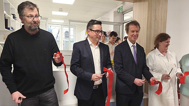 Šumperk'teki hastanenin onkoloji bölümünün törenle açılışı. Soldan sağa: Radyasyon onkolojisi başkan yardımcısı ve Radyasyon Onkolojisi, Biyoloji ve Fizik Derneği başkanı Martin Doležel, yanında gözlüklü Šumperk Hastanesi Yönetim Kurulu Başkanı Martin Polach, Fakülte Hastanesi Olomouc Onkoloji Kliniği başkanı Profesör Bohuslav Melichar ve Šumperk Hastanesi onkoloji bölümü başkanı Hana Švébišová var.