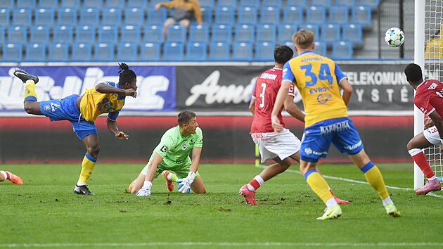 Teplice Benjamin Nyarko (solda) büyük bir şans verir ve Pardribice Jáchym Šerák'ın hedefini geçer.