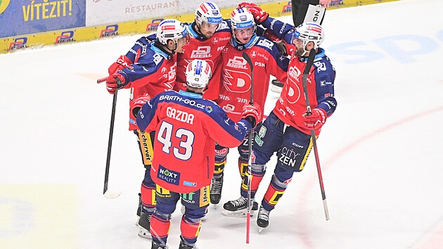 Pardubice'li hokey oyuncuları Komety kalesinde attıkları golün ardından sevinç yaşıyor.