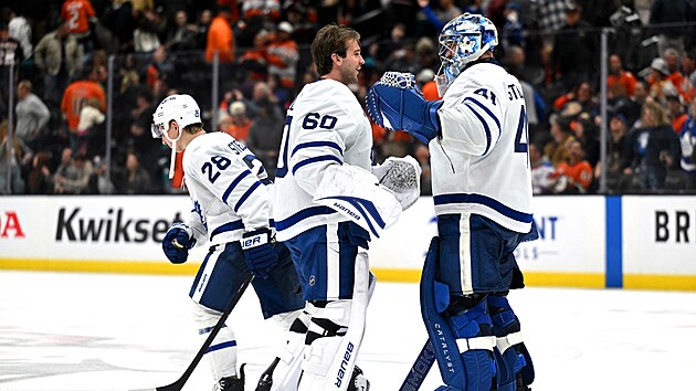 Torontolu Anthony Stolarz (Sağda) ve Joseph Woll, Anaheim'daki kurtarışlarının ardından kutlama yapıyor.